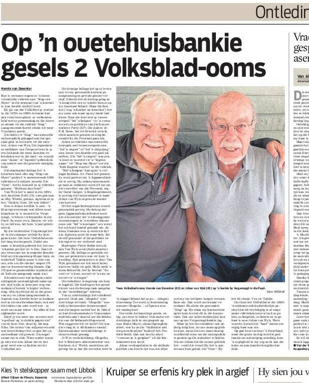 Amper 170 jaar se lewenservaring – indien dan nie 170 jaar se lewenswysheid nie! – was op ‘n bankie by die Vergenoegd- tehuis in die Paarl byeen vir ‘n nostalgiese ekspedisie die verlede in toe ek vir Johan van Wyk, die “Oom” van Stop van Myne gaan kuier het. Agterna was ‘n vogtigheid in die oog. In Volksblad word die sluier vanoggend gelig oor waaroor als gesels is – van ‘n Mej. Wereld tot edele regters. Hier is die skakel:https://www.netwerk24.com/netwerk24/nuus/aktueel/op-n-ouetehuisbankie-gesels-2-volksblad-ooms-oor-doerie-dae-20240926