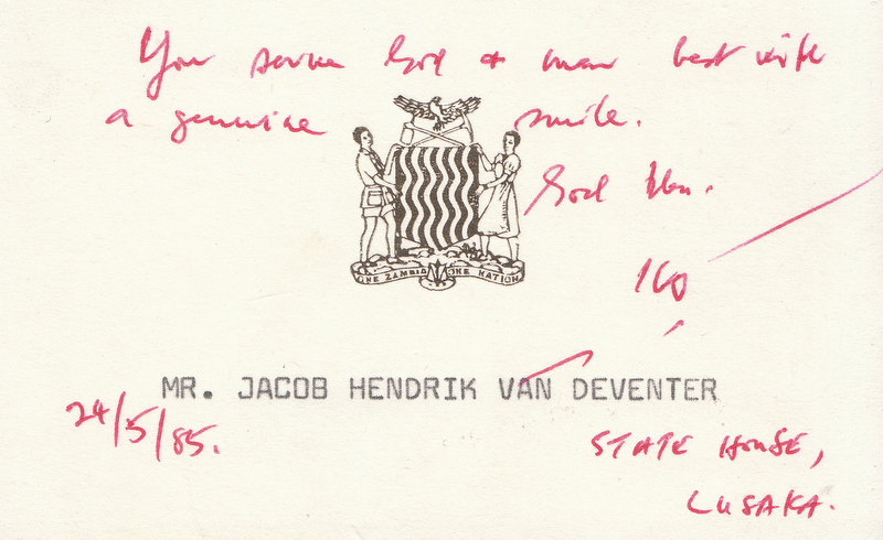 Herinner my toe aan een van my eerste ervarings van “oor-grens-diplomasie”. Dit was was op 25 Mei 1985. Ek is daardie dag saam met die joernaliste Hugh Murray (Leadership), Willem de Klerk (Rapport), Jan van Zyl (SAUK), Tertius Myburgh (Sunday Times), Harvey Tyson (Star) en Harald Pakendorf (Vaderland) in ‘n Citation van Anglo American na Lusaka vir ‘n ontmoeting in State House met pres. Kaunda.