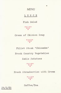 Op die foto’s is vir eers ‘n boodskappie van die president op my naamkaartjie aan tafel. Het die Zambiërs maar vergewe dat hulle my naam Jakob met ‘n c gespel het. Baie mense doen dit. Op die ander foto is die spyskaart van die dag. Nogal lekker filet gewees. Die naam van die wyn ontbreek opsigtelik.