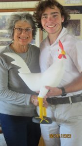 Die houtweergawe is deur kleinseun Jacob Claassens by n straatventer buite Hazyview aangeskaf. Van toe af is geraai en geredekawel hoe die hoender – te groot vir een van die tasse – ongeskonde in die Kaap gaan kom.