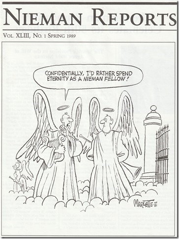 ‘n Nieman-soewenier waaraan ek waarde heg, hang aan ‘n gedenkmuur in my studeerkamer. Dit is ‘n geraamde skets van twee gevleuelde engele op die voorblad van die Nieman Foundation se tydskrif, Nieman Reports. Een engel verklap ewe ondeund aan die ander: “Confidentially, I’d rather spend eternity as a Nieman Fellow.”