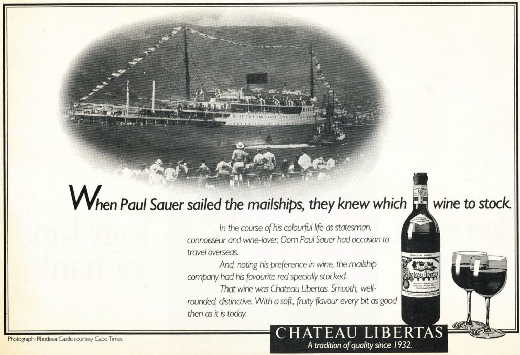 Toe onthou ek die advertensie wat ek gesien het vir die wyn waaraan Sauer op sy reise voorkeur sou gegee het. Dankie tog vir Chateau Libertas waarop ek altyd kon terugval, ook lank na daardie vaart. (Daardie tradisionele Pendennis-drankie Pimms No. I, vrugtig met ’n stewige jenewerbasis en ’n paar titseltjies verskillende likeurs, het ek ook lank gekoester. )