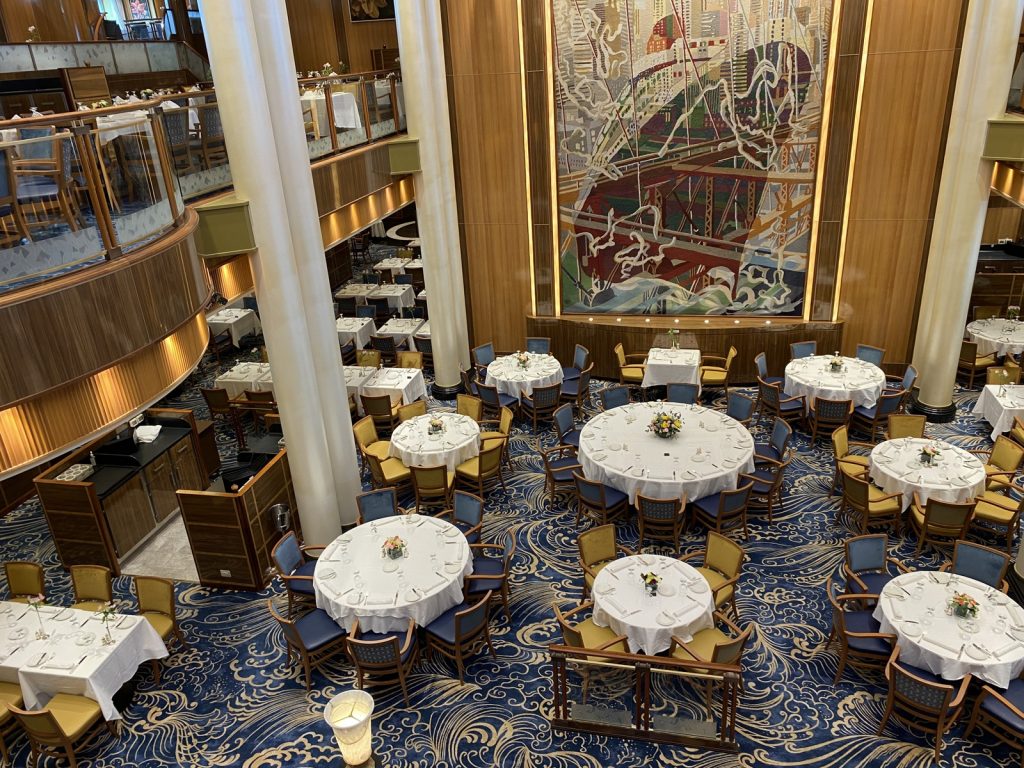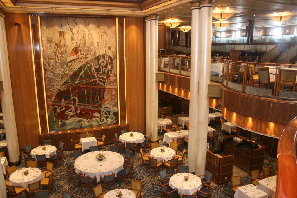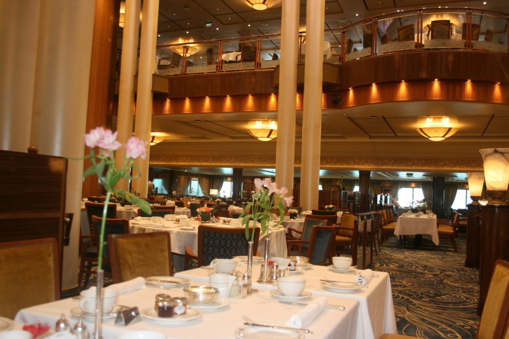 Party tafels het plek vir tien. Die meeste vat vier. My en Tokkie se 487 was ‘n begeerlike tweemanstafel met ‘n onbelemmerde see-uitsig deur ekstra groot vensters. (Op ons Sydneyvaart 10 jaar gelede was dit 114, nader aan ‘n venster maar met twee tafelmaats.)