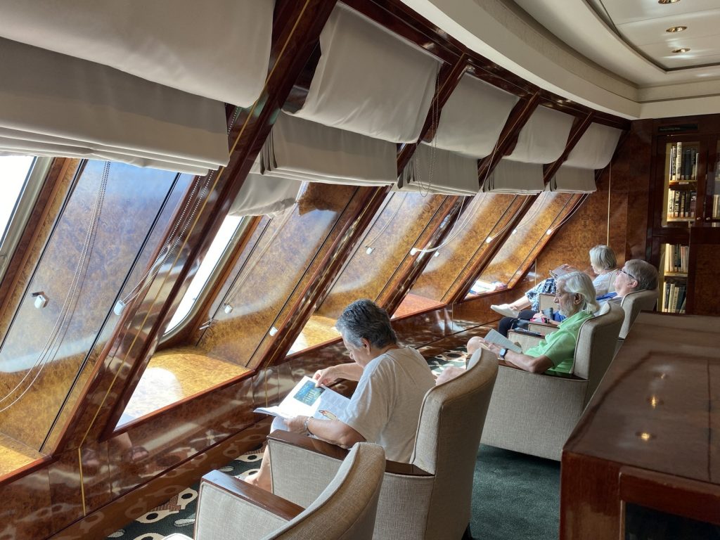 By die groot vensters met hul praguitsig is ’n ry smaakvolle gemakstoele. Genoeglik is dit om daar nes te skop met jou boek, net af en toe op te kyk oor die groot oseaan heen en waar te neem hoe die reuseboeg die waters klief.