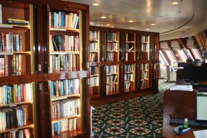 In ‘n keurposisie op dek agt, in die boeg met groot, diep vensters op die waters wat voor die statige skip oopkloof, is die Queen Mary 2 se beroemde biblioteek – ‘n karaktervolle boekeparadys met iets soos 10 000 titels in ses tale.