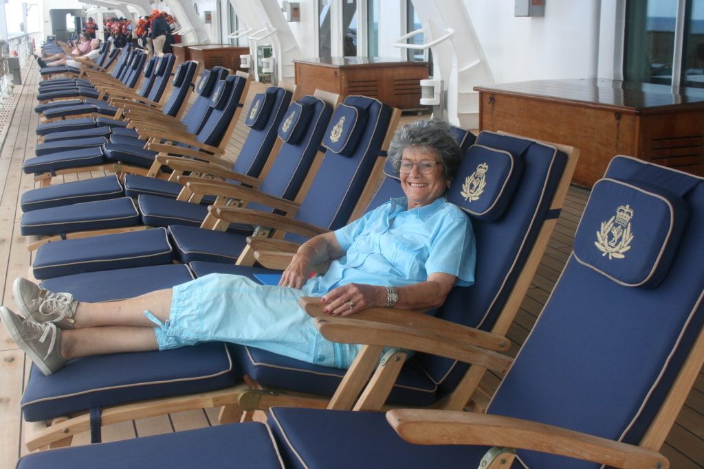 Gelukkig is veral op die Promenadedek, dek 7, vir die doel honderde net-reg-houtstoele in simmetriese rye met deftige donkerblou kussings waarop die embleem van Cunard-redery met goue draad geborduur is.