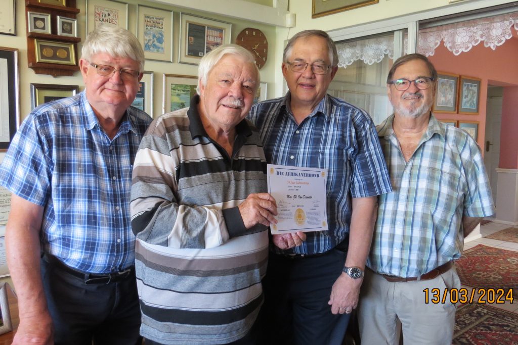 Gister is nog ‘n verbintenis van 50 jaar verseël. ‘n Afvaardiging van die Afrikanerbond het my sertifikaat kom oorhandig vir ‘n halfeeu se lidmaatskap van die trotse organisasie. So welaangenaam en verrykend soos daardie verbintenis was /steeds is, so welaangenaam was die besoek. My sertifikaat is klaar geraam en vervang die een met die syfer 40 op my “gedenkmuur” in die woonkamer.