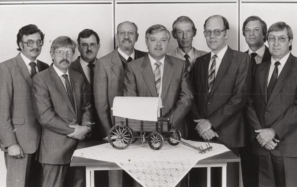 Hier is ook ‘n geraamde foto van die (heelwat groter) hoofredaksie in 1986 by ‘n die replika van ‘n ossewa, geskenk deur die ATKV. Die Volksblad het dit verwerf met sy dekking van die simboliese Groot Trek. Dit is beoordeel as die beste van alle media in die land. Wonder waar is die waentjie nou.
