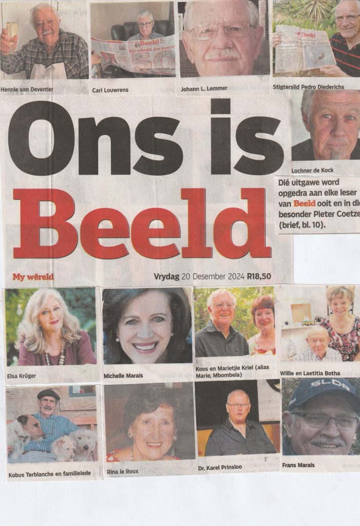 My eerste Volksblad-verbintenis was in die 60’s in die tydvak van Oom Bart Zaaiman met sy gevreesde rooi pen. Hy had ‘n dogter, Marietjie. Sy het haar pa se liefde vir Afrikaans geërf. Nou die eggenote van ds. Koos Kriel van die Laeveld het sy met die alias Marie van Mbombela briewe op Beeld laat reën. Ek het die Kriels ook op Kaapsehoop gesien, en sien julle periodiek op Melkbos waar hulle vakansie hou. Het dadelik hul foto herken.