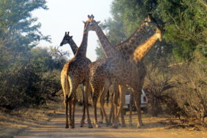 Wat ons gesien het, prakties gesproke, was minstens ‘n dosyn kameelperde waarvan vyf uiteindelik in die middel van die pad was. Ons het heelwat nekaktiwiteit oor en weer waargeneem. Binne bestek van ‘n paar minute het twee bestygings gevolg. By een was penetrasie onmiskenbaar. Jy sien dit op die foto.