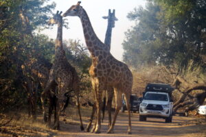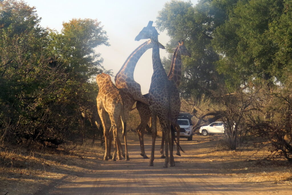 Wat ons gesien het, prakties gesproke, was minstens ‘n dosyn kameelperde waarvan vyf uiteindelik in die middel van die pad was. Ons het heelwat nekaktiwiteit oor en weer waargeneem. Binne bestek van ‘n paar minute het twee bestygings gevolg. By een was penetrasie onmiskenbaar. Jy sien dit op die foto.