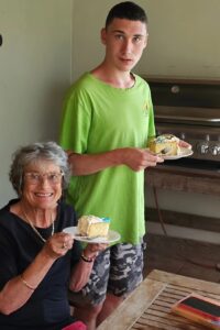 Oupa Hennie en Ouma Tokkie het die week vir Migael kom kuier. Wat ń fees! Hulle het van Migael se verjaardagkoek (plegtig gevries sedert 31 Augustus) saam met hom geniet, die nuwe Klein Karoo Markt besoek en ons Landrani Meatmaster skape ontmoet. Ma Tokkie het vir ons 6 gaanse verduidelik wie’s baas, en Tokkie (ons haan en Ma se naamgenoot) het sonder ophou gekraai