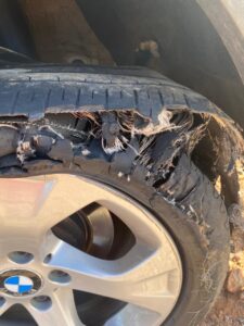 Die flenterband op die derde foto is nie regtig Oudtshoorn-verwant nie, buiten dat die volstruisdorp se Tyremart en GH Towing saam met Johan – en ook die AA – in meerdere en mindere mate geskitter het om die noodsituasie vinnig te beredder nadat ‘n agterband naby Caltzdorp gebars het. Genoemde band het heelwat vinniger gedisintegreer het as wat ‘n sogenaamde “Run flat” volgens die bemarkers behoort te doen.