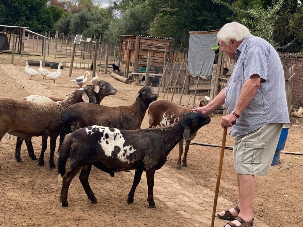 Dan is daar die foto van die uwe in ‘n ongewoon landelike toneel: die nadere kennismaking met kleinseun Migael van Deventer se kuddetjie Landrani meatmasters op seun Johan en skoondogter Mariza se plek aan die Grobbelaarrivier met die ietwat ambisieuse naam van “Ons Plasie” . (Maar daar is darem ook ganse en hoenders, granaat- en olyfbome en hawerkampe wat groen begin uitslaan.) Die vreemde wese met sy grys kapsel en kierie het duidelik die mooi skapies se belangstelling geprikkel.