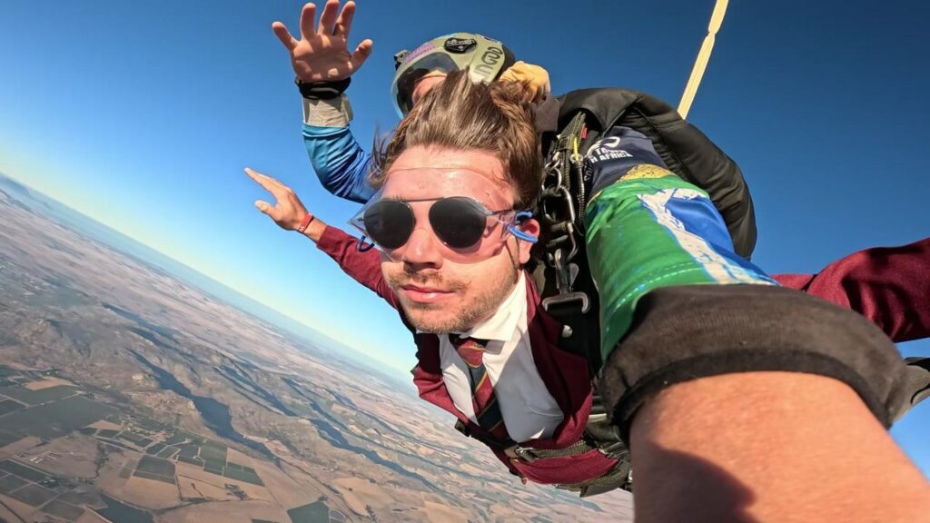 Kleinseun Thomas Claassens (21), ‘n student in die Regte in sy vierde jaar, is vanjaar Eendrag se primarius. Verlede Saterdag trek hy toe sy dagdrag aan – kleurbaadjie met sakwapen, Chinolangbroek, das, die lot – en spring so gestewel en gespoor op 10 000 voet uit ‘n ligte vliegtuig met ‘n valskerm; sy eerste sprong, maar darem saam met ‘n ervare instruktrise.