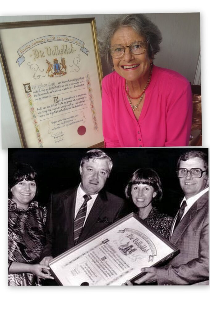 By die amptelike ontvangs van die oorkonde spreek ek graag ook ‘n woordjie van waardering aan ander staatmaker-bouers aan die Kunsmark deur die jare soos Georjane Oberholzer, Marietjie Gericke, Henriëtte (Anderson) Loubser en Alet Coetzer.