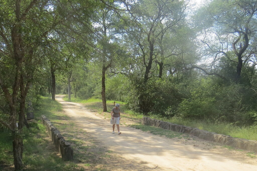 34 Tokkie-treë ooswaarts van die ingang na Tarlehoet Apiesdoringlaan se kant toe het my dapper vrou vanoggend op haar oggendwandeling ‘n luiperd in Wilgevylaan, Sabiepark, raakgeloop. In die middel van die pad
