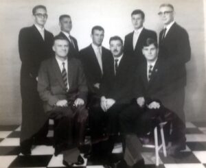 Op die HK-foto, ongelukkig van onbevredigende gehalte omdat dit agter glas is, is is nou net ‘n skamele drie van die agt oor: die uwe (sittende in die middel), Pierre le Roux (regs van my) en Piet Theron (agter my en Pierre). Die oorledenes is van links Arend de Waal, Oom Chris de Wet (huisvader), Naas du Toit, Hennie Smit en Jan-Jacob de Jager (heel regs).