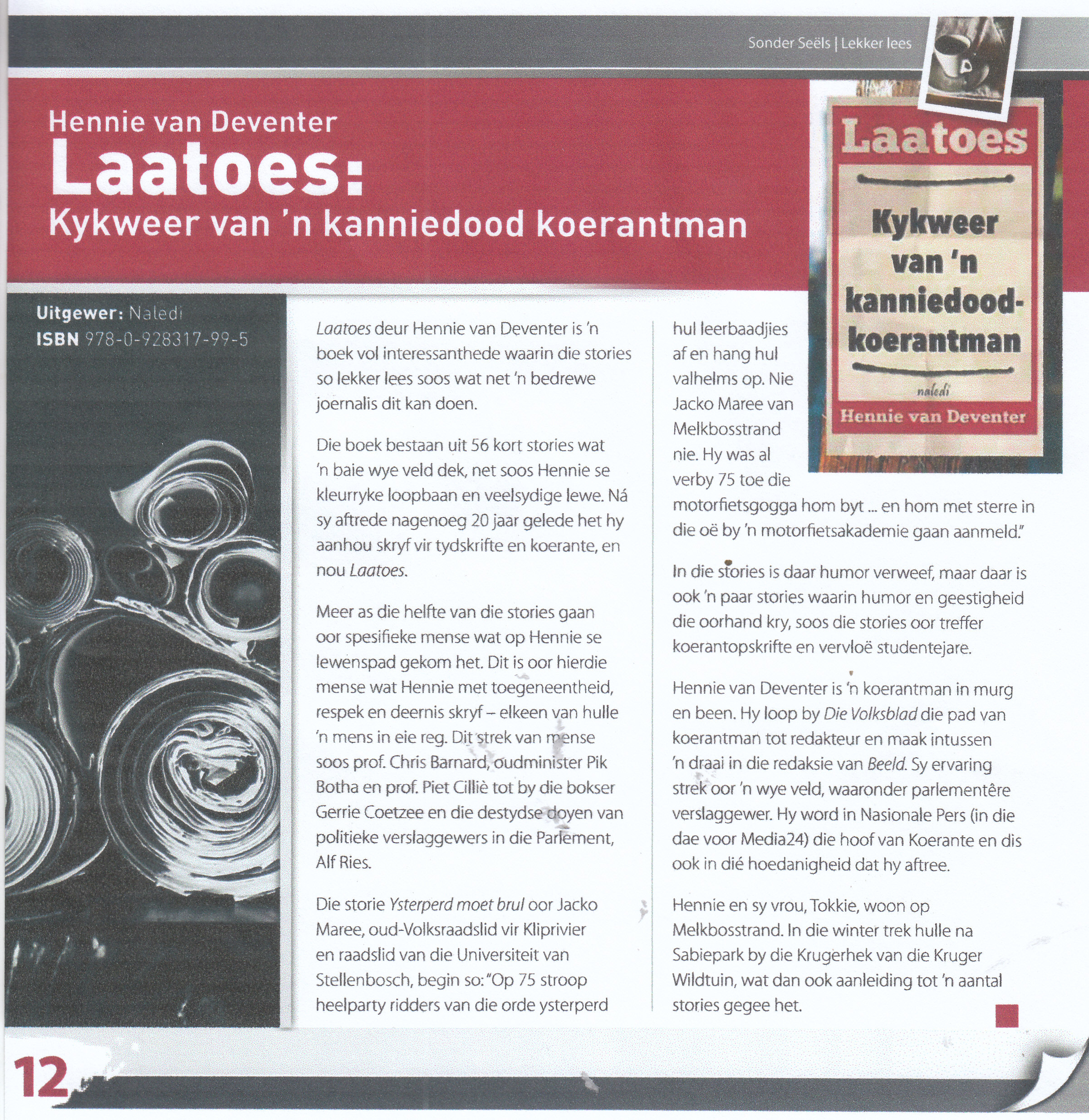 Met my rondkrappery vir resensies en allerlei kommentare op boeke uit my pen, ontdek ek, nogal verrassend, dat oor een boek meer mooi dinge deur meer mense kwytgeraak is as oor elke ander een van die 25 of so. Dit is Laatoes – Kykweer van ‘n kanniedood-koerantman. Selfs die Woordeboek van die Afrikaanse Taal (WAT) het my genooi om oor hom te kom praat op Stellenbosch.