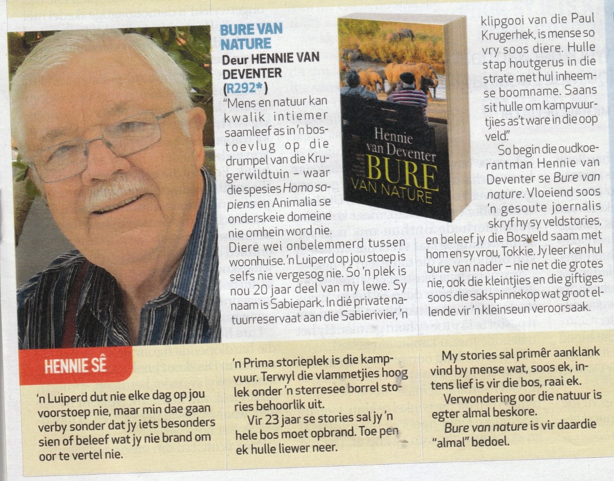 Van die jongste in die bos-kategorie, Bure van nature, is taamlik wyd kennis geneem. Ek het geen kritiek gelees nie. Tog was die verkope teleurstellend. Ek skryf dit daaraan toe dat Protea nie daarin kon slaag om die boek in die wildtuin op die rak te kry nie. Francois Smith se Kamphoer was wel. Dit is blykbaar deur die keurder gelees as Kamp hoër.