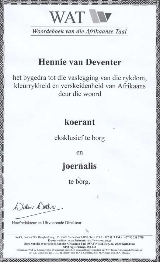 Trouens, so verweef is koerante met die vesel van my DNA dat ek afgesit het na die WAT (Woordeboek van die Afrikaanse Taal) op Stellenbosch toe om die woord “koerant” te koop. Dit is my eksklusiewe woord in die WAT en is veelseggend van my holistiese passie vir die koerant as entiteit.